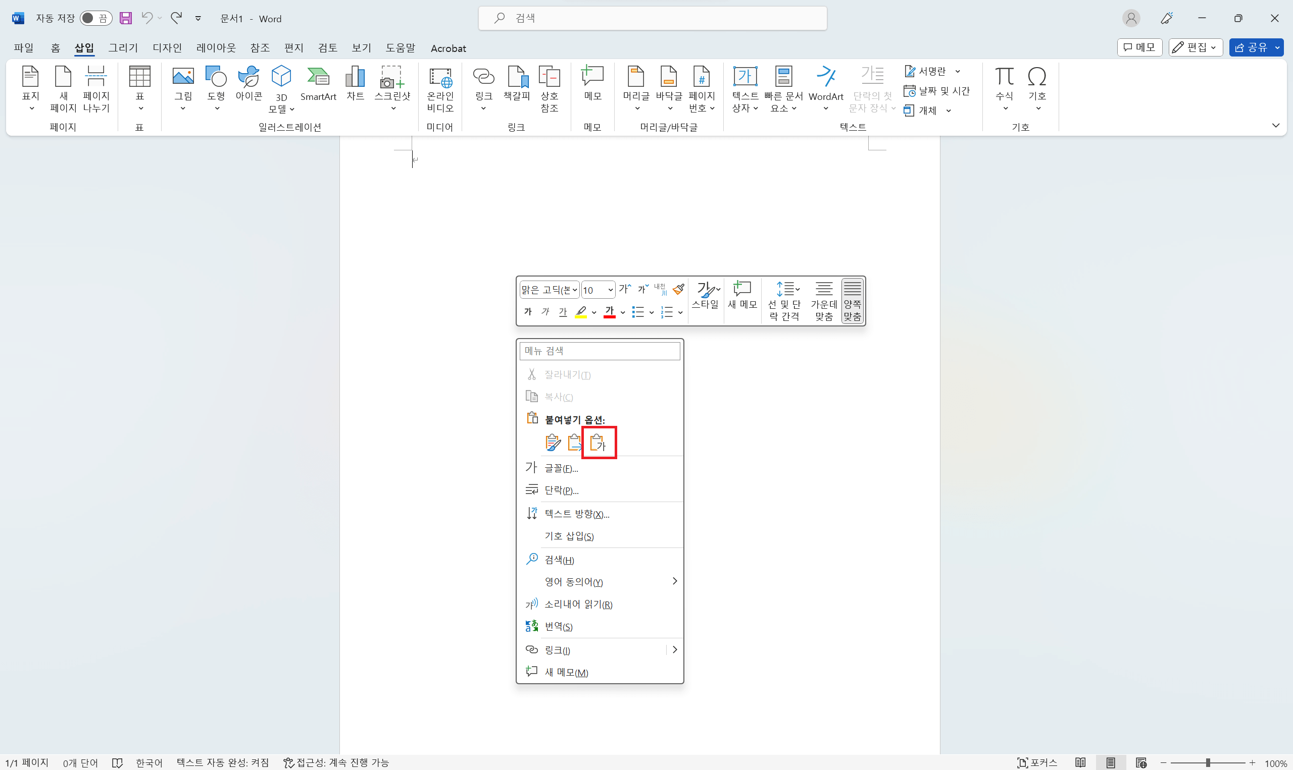 "붙여 넣기 옵션"에서 "텍스트만 유지"를 선택하시면 동일한 효과를 얻을 수 있습니다.