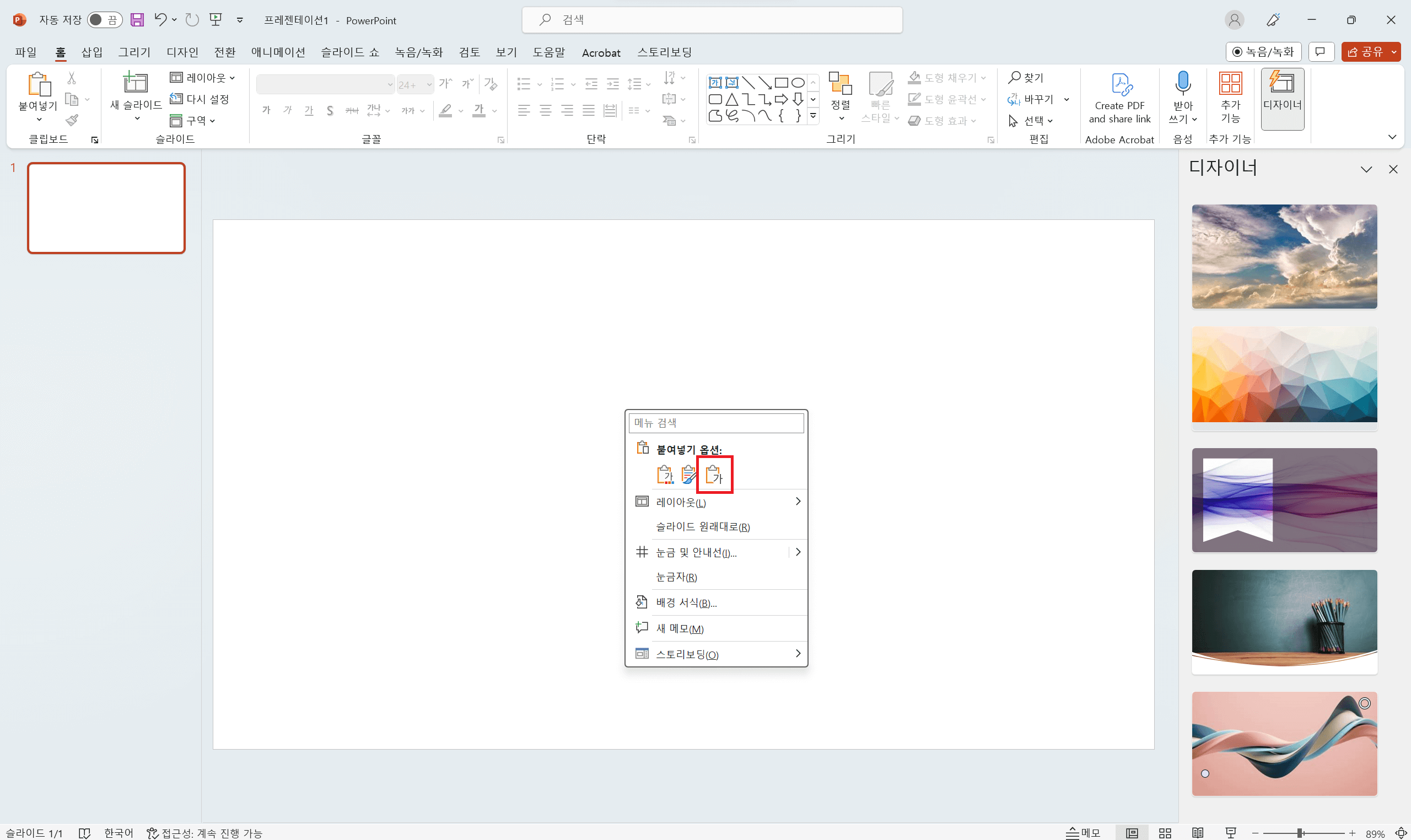 붙여 넣기 하시 싶은 곳에서 오른쪽 마우스를 클릭하면 팝업 메뉴가 나오는데