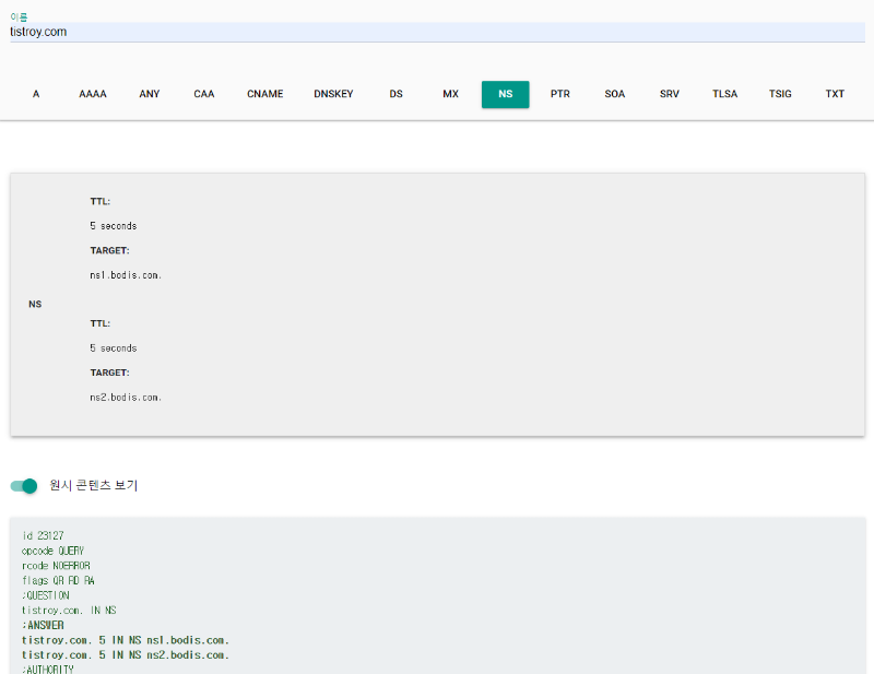 A 레코드, CNAME, MX, NS ,TXT 등 네임서버에서 설정된 정보를 볼 수 있습니다.