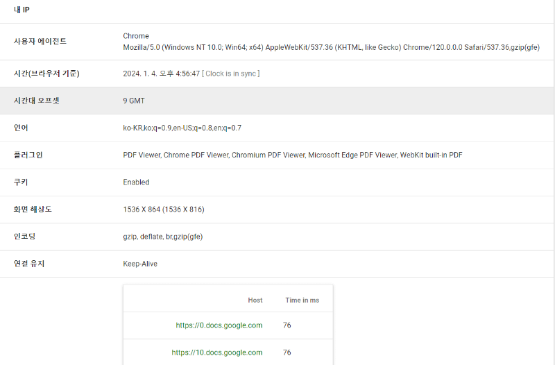 사용자 아이피, 에이전트, 시간, GMT 시간, 언어, 구글 주요 사이트와 연결이 잘 되는지 확인할 수 있지만,
