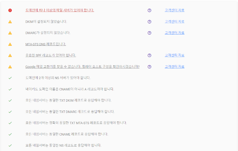 "도메인에 2개 이상의 NS 서버가 있어야 합니다." 부분부터 하단 내용은 모두 정상으로 나타나게 설정하는 것이 좋습니다.